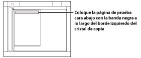 Ponga la página de prueba con el anverso hacia abajo en el cristal de copia, con las bandas negras junto al borde posterior superior izquierdo del cristal de copia por la flecha.