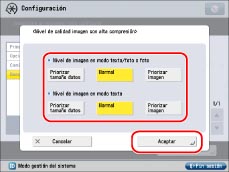 La opción de nivel de calidad de imagen se activa si utiliza el modo seleccionado para [Tipo de original] en [Copia] o [Archivos guardados]. No obstante, si selecciona [PDF (Trazar y suavizar)] como formato de archivo y [Texto] como tipo de original, esta opción no es válida.