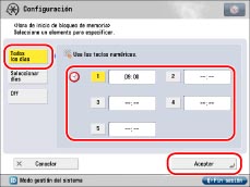 Si selecciona [Todos los días], seleccione un número ([1] a [5]) → introduzca la hora de inicio con