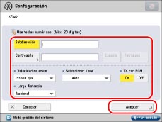 Pulse [Establecer detalles] para especificar las opciones de subdirección, contraseña, TX con ECM, velocidad de envío y larga distancia. Si configura el equipo para utilizar varias líneas, puede seleccionar la línea que se utilizará para enviar.