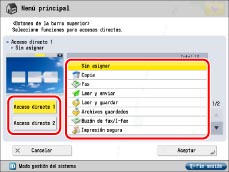 Si el número de botones de función supera el número de botones de la disposición especificada en <Botones del menú principal>, los botones sobrantes aparecen después de la página 2 de la pantalla Menú principal. En la pantalla Menú principal puede aparecer un máximo de 16 botones.
