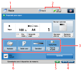 Aquí se muestra el progreso de los trabajos y las operaciones de copia, así como el estado de los dispositivos y consumibles. Además, según el servicio de inicio de sesión que esté utilizando, aquí puede aparecer el ID de departamentos o el nombre de usuario.