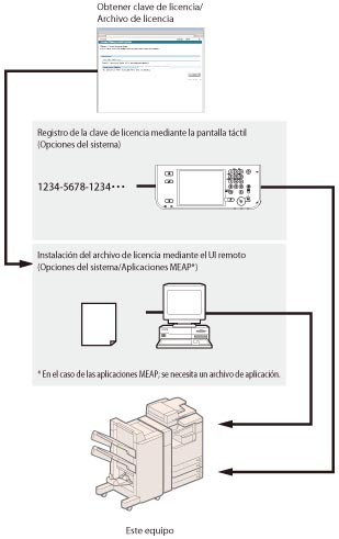 http://canon.com/fau/downloads Cuando descargue los manuales y el software asociado de las opciones de sistema/aplicaciones MEAP, prepare el certificado del número de acceso de la licencia que forma parte del paquete.