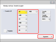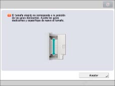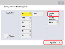 → introduzca los valores correctos.Para seleccionar un tamaño de papel guardado en un botón de tamaño ([S1] a [S5]), debe guardar de antemano el tamaño de papel no estándar en el botón de tamaño. Para conocer las instrucciones acerca del almacenamiento de tamaños de papel no estándar, consulte "Guardar/editar/eliminar tipos de papel personalizados".