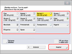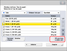 Puede guardar tipos de papel que no aparecen en la lista de opciones detalladas de la selección del tipo de papel. Para información acerca de cómo guardar un tipo de papel personalizado, consulte "Guardar/editar tipos de papel personalizados".