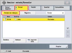 Se imprime una lista de transmisiones de fax, correo electrónico, I-fax, servidor de archivos y buzón en la lista de trabajos de envío.