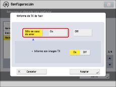 Si desea imprimir parte del documento enviado en el informe de TX de fax, pulse [On] para <Informe con imagen TX>.