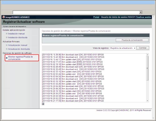 Pulse [Opciones de gestión de software] → [Seleccionar vista de registros] → [Mostrar registros de actualización].
