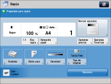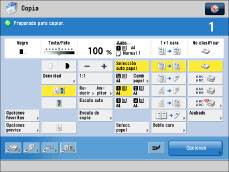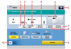 Puede llevar a cabo las mismas operaciones en la pantalla de funciones básicas de copia normal y en la pantalla de funciones básicas de copia rápida. Establezca la pantalla que se va a mostrar desde la pantalla Configuración. (Consulte "Cambiar la pantalla de funciones básicas de copia".)