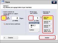 Si el papel que va a utilizar como hojas de inserción ya está impreso (por ejemplo, con el logotipo de la empresa), debe seleccionar [Dejar en blanco]. En caso contrario, el equipo copiará en el papel ya impreso.