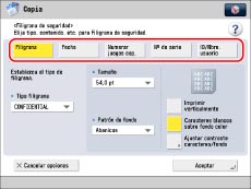 El texto que introduzca en [Person.] no se guarda automáticamente. Si usa [Filigrana de seguridad] y desea guardar la filigrana de seguridad recién creada para seleccionarla cuando lo necesite, pulse [Guardar] → introduzca el texto que va a guardar.