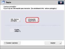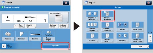 *2 Hace referencia a funciones como copia en cadena, escala de copia (zoom), formato de página, modo Cuadernillo, densidad, numerar páginas y numerar juegos de copias, que especifican reducción, ampliación y cambios de impresión y densidad.