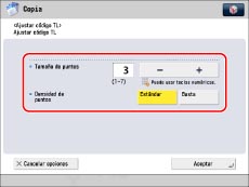 El tamaño apropiado de los puntos varía según el entorno o el contenido del original. Le recomendamos que compruebe los documentos que tengan incrustado un código TL para ver si puede analizar correctamente la información de seguimiento y si el código TL restringe las copias.