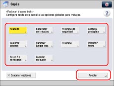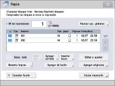 Para comprobar las opciones de copia para el documento combinado, pulse [Revisar opc. globales].