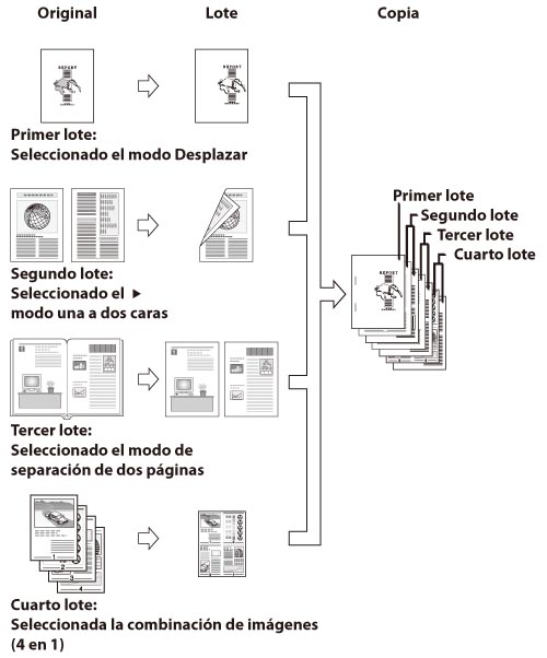 Este modo permite leer varios lotes de originales con distintas opciones de copia e imprimirlos como un solo documento.