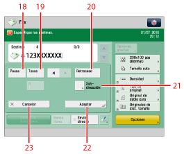 Se pulsa para insertar una pausa de varios segundos en el número de fax que se está marcando. Si pulsa [Pausa] entre números, aparece la letra <p> entre ellos. Si pulsa [Pausa] al final de un número, aparece la letra <P> al final de ese número. Al marcar un número del extranjero, inserte una pausa después del prefijo de país y al final del número de teléfono.(Consulte "Duración de pausa".)