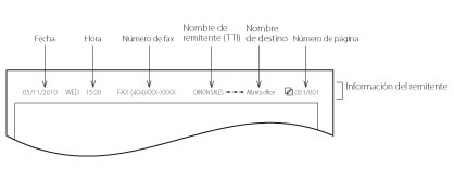 Si el equipo está programado para que se imprima la información de remitente en la cabecera del papel de impresión, y no están guardados todos los elementos, se imprimirán sólo los elementos guardados y el número de páginas total del original.