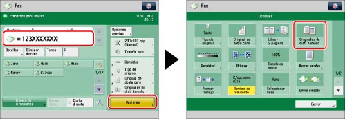 Especifique el destino → pulse [Opciones] → [Originales de dist. tamaño].