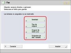 En la pantalla de funciones básicas de fax aparecen dos accesos directos a las opciones. [Original de doble cara] y [Originales de dist. tamaño] aparecen de forma prefijada. Estos accesos directos pueden cambiarse por las funciones que utiliza con frecuencia.