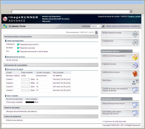 El IU remoto permite acceder al equipo a través de una red para visualizar su estado actual y su configuración, así como el estado de todo el procesamiento de la información y de los trabajos. El equipo se puede gestionar desde un ordenador conectado a la red sin tener que realizar operaciones en el propio equipo. Si especifica la dirección IP del equipo en el navegador web, la página de inicio o la pantalla principal del IU remoto aparece en la pantalla del ordenador, como se muestra a continuación: