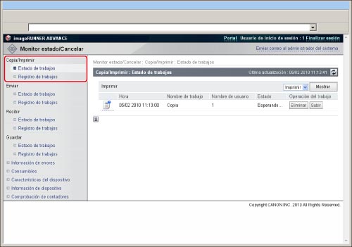 Muestra el registro de trabajos de impresión local, incluidos los trabajos procedentes del Buzón RX en memoria o de buzones de fax confidencial.