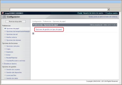 Haga clic en [Configuración] → seleccione [Opciones de papel] para <Preferencias> → haga clic en [Opciones de gestión de tipos de papel].