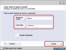 Si inicia sesión estando activada la opción [Guardar contraseña], puede guardar el ID de usuario y la contraseña que ha introducido. La próxima vez que inicie sesión se introducirán automáticamente el ID de usuario y la contraseña. Por otro lado, si inicia sesión estando desactivada la opción [Guardar contraseña] al guardar el ID de usuario y la contraseña, el ID de usuario y la contraseña guardados se borran.
