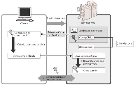 Puede lograr una comunicación cifrada segura cuando el usuario accede al equipo a través de un navegador web instalando un certificado de servidor en el equipo. Con la comunicación SSL, mediante el certificado de usuario y la clave pública se genera una clave común que sólo el usuario y el equipo pueden utilizar. De esta manera se puede impedir la intercepción y el robo de datos. Consulte