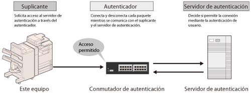 Gestiona toda la información de autenticación a través del servidor de autenticación (RADIUS: Remote Authentication Dial In User Service) y autentica al solicitante. Puede impedir el acceso no autorizado, ya que únicamente el solicitante autenticado por el servidor RADIUS tiene permiso para conectarse a la red por parte del autenticador.