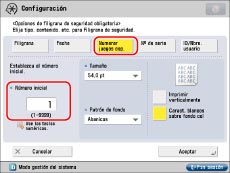 Para conocer las instrucciones acerca de la introducción de caracteres, consulte "Introducir caracteres desde la pantalla táctil". Si ha guardado caracteres en [Guardar caract. para numerar págs/Filigrana] en [Opciones de funciones] (Configuración), puede seleccionarlos de la lista.