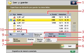 Para conocer las instrucciones acerca de cómo ordenar las carpetas, consultar la información detallada del archivo y editar o eliminar archivos, consulte "Archivos guardados".