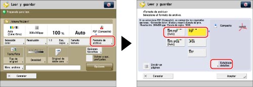 Si selecciona [Compacto] para el formato de archivo PDF, el modo de color cambia de [Auto (Color/Negro)] y [Blanco y negro] a [Auto (Color/Gris)] y [Escala de gris]. Si desea leer el documento con el modo de color que especifique, cambie el formato de archivo PDF a otro distinto de [Compacto] o [Trazar y suavizar].