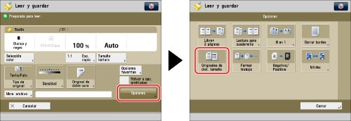 Si en Tamaño de lectura elige una opción distinta de [Auto], todos los originales se leen con el tamaño especificado. Si desea leer cada original con su tamaño original, elija [Auto] en Tamaño de lectura.