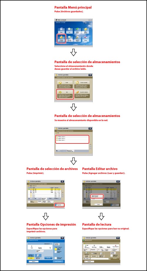 Para ver el procedimiento acerca de [Agregar archivos (Leer y guardar)] y conocer las instrucciones acerca del manejo de la pantalla de lectura, consulte "Agregar un archivo (Leer y guardar)" y "Flujo de operaciones de leer y guardar".