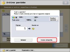 Si aparece la siguiente pantalla después de leer el último lote de originales, pulse [Iniciar almacmto.].