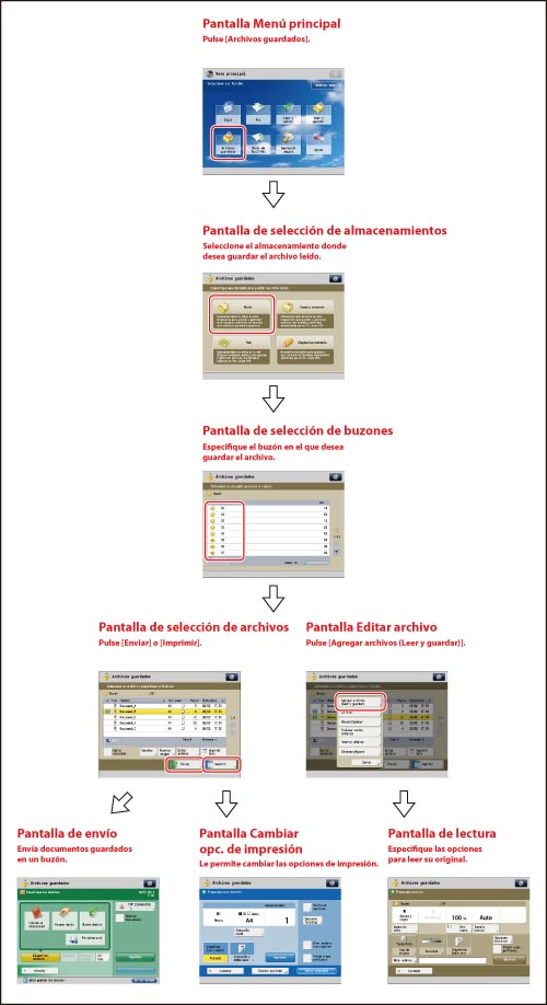 Para ver el procedimiento acerca de [Agregar archivos (Leer y guardar)] y conocer las instrucciones acerca del manejo de la pantalla de lectura, consulte "Agregar un archivo (Leer y guardar)" y "Flujo de operaciones de leer y guardar".