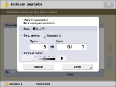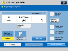 Si desea imprimir un archivo guardado en el equipo desde un ordenador o utilizando [Guardar en buzón] de la función Copia con las opciones que se establecieron cuando se guardó el archivo, no imprima el archivo desde la pantalla Cambiar opc. de impresión. Si lo hace, el archivo puede no imprimirse con las mismas opciones que se establecieron cuando se guardó.
