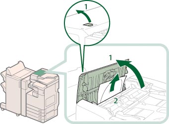 2. Gire el mando de alimentación de la parte interior de la tapa del alimentador y extraiga el papel atascado.