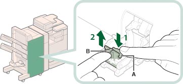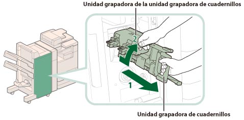 2. Tire de la grapadora de la unidad grapadora de cuadernillos hacia usted y, a continuación, súbala. |