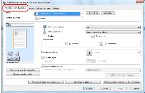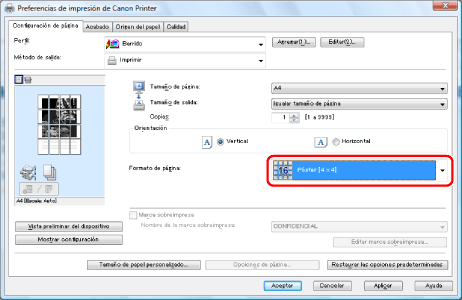 Si no puede seleccionar las opciones de [Formato de página], muestre la hoja [Configuración del dispositivo] y, a continuación, seleccione [Auto] o [Activado] en [Activar cola en el host]. Para obtener instrucciones acerca de cómo mostrar la hoja [Configuración del dispositivo], consulte "Configuración de las opciones de impresora."