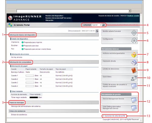 Si cambia el idioma de visualización desde la página del portal del IU remoto, el idioma puede no mostrarse correctamente si el idioma seleccionado es distinto del idioma utilizado en la pantalla táctil del equipo.