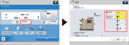 如果预先将信息存储到本机中,则添加到每个纸盒中的纸张类型的图标就可以显示在纸张选择屏幕上。(See "注册/编辑自定义纸张类型.")