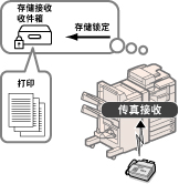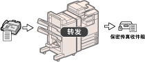 可以将本机设置为使用所需发送设置自动将符合指定转发条件的已接收传真文档转发至任何接收方。也可以将已接收传真文档转发到其他机器(中继功能),或将已接收保密文档自动存入“保密传真收件箱”。也可以将自动转发设置为在指定时间启用。由于不符合转发条件的已接收文档也可以转发至所需接收方,因此可用该功能将已接收传真文档分类,并发送给合适的接收方。