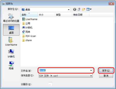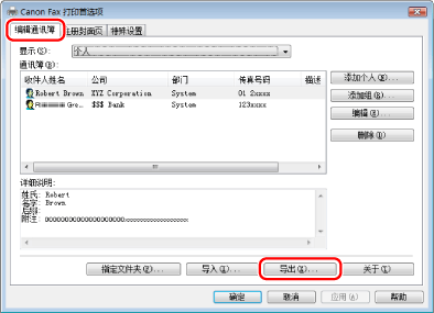 如果在[特殊设置]页的[安全设置]对话框中选择了[导出通讯列表时受密码保护],则单击[导出]时会显示用于输入密码的对话框。有关详细信息,请参阅联机帮助(请参阅“查看联机帮助”)。