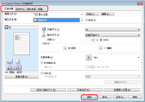单击[页面设置]、[完成方式]、[纸张来源]和[质量]页的选项卡,然后指定所需的项目。