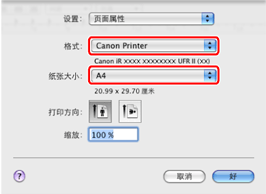 在Mac OS X 10.5.x中,根据所使用的应用程序,可能不显示[页面设置]对话框。如果是这种情况,可以在[打印]对话框中指定纸张大小、打印方向和缩放。有关如何显示[打印]对话框的详细信息,请参阅“