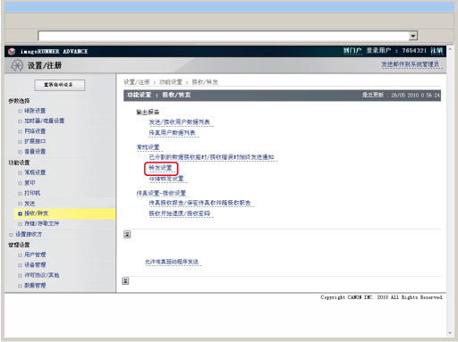 也可以通过按“设置/注册”下的[功能设置]→[接收/转发]→[常规设置]→[转发设置]从本机的操作面板指定转发设置。有关使用操作面板指定转发设置的说明和转发设置的详细信息,请参阅"接收/转发."