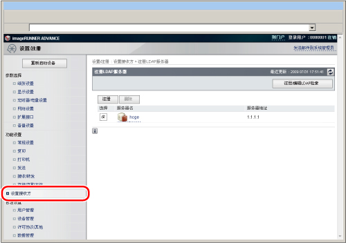 (设置/注册)→[设置接收方]→[注册LDAP服务器]可访问的设置相同。有关使用操作面板指定LDAP设置的说明,请参阅"LDAP服务器设置."要指定LDAP服务器设置,必须以管理员身份登录。