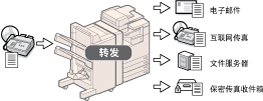 可以设置使用所需发送设置自动将符合指定转发条件的已接收互联网传真文档转发至任何接收方。可以将已接收的互联网传真文档转发至其他机器(中继功能),或将其存入“保密传真收件箱”。也可以将自动转发设置为在指定时间启用。由于不符合转发条件的已接收文档也可以转发至所需接收方,因此可用该功能将已接收互联网传真文档分类,并发送给合适的接收方。