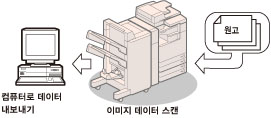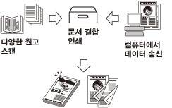 스캔하여 저장 기능을 사용하면 스캐너 유니트에서 스캔되었거나 컴퓨터에서 작성된 문서 데이터를 저장할 수 있습니다. 저장된 데이터를 지정된 시간에 인쇄하거나 동시에 처리할 수 있도록 개별적으로 저장된 데이터나 컴퓨터에 작성된 데이터와 결합할 수 있습니다.